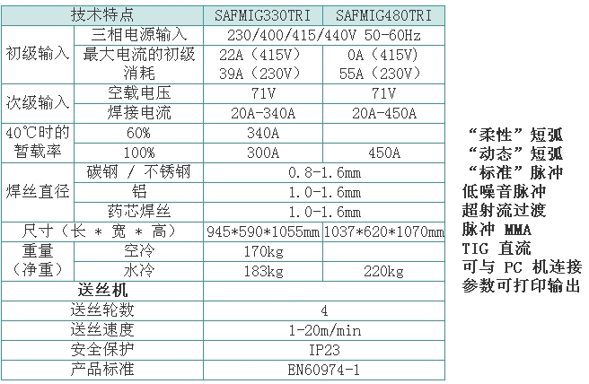 數字化雙脈沖鋁焊接設備,在汽車、造船、高速列車、航天航空及壓力容器等制造領域得到廣泛應用。 SAFMIG330TRI/480TRI 脈沖熔化極氣保護焊機為 16 位微處理器閉環數字控制晶體管暫斬波電源、焊機內焊接專家系統,各種母材,焊絲,氣體組合焊接程序達 100 多組,協合式單旋鈕調節,具有熱起弧功能,此外還設置了“雙脈沖”功能,適用于鋁及鋁合金,不銹鋼,碳鋼及低合金鋼的焊接。